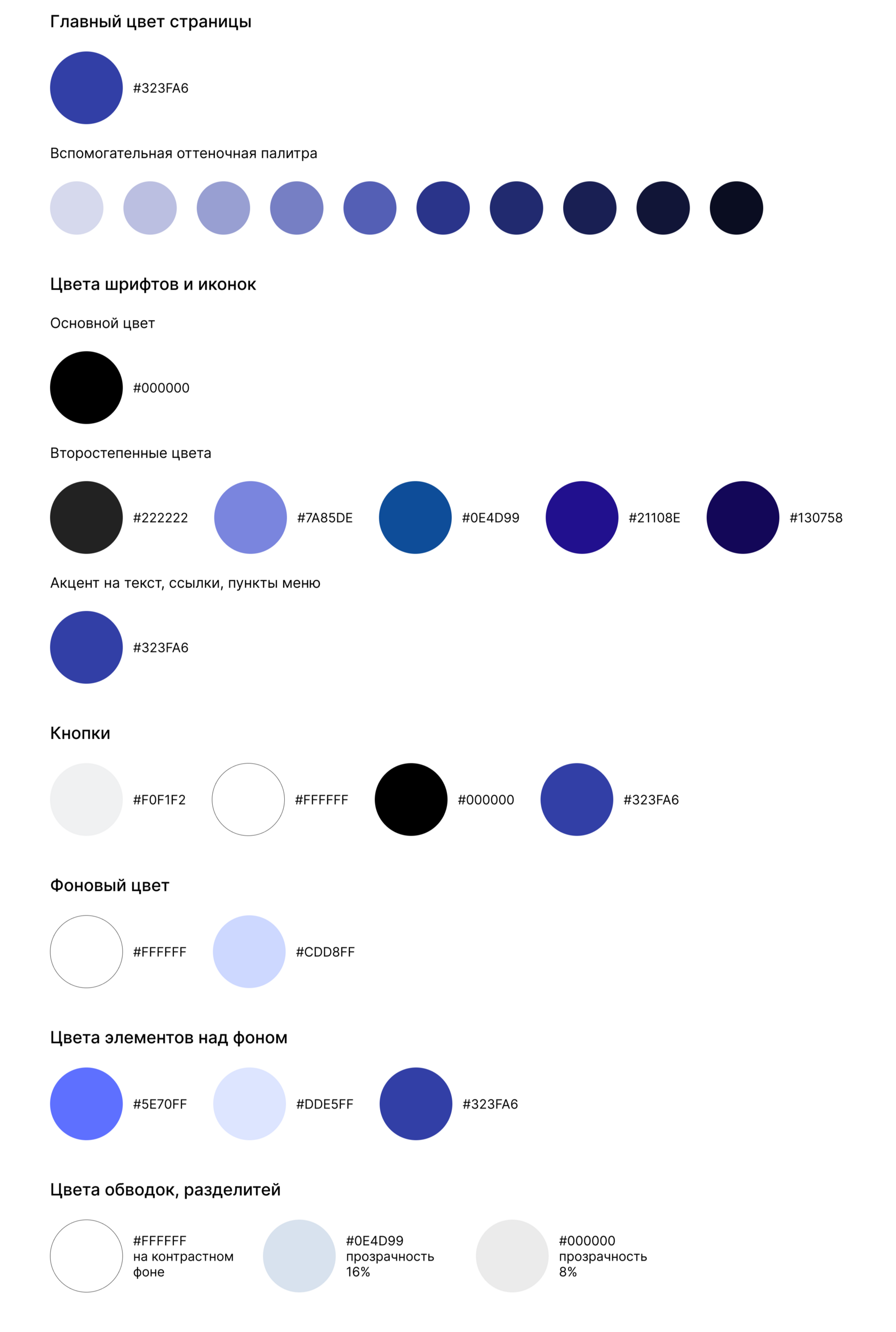 • Используйте основной синий (#323FA6) для ключевых элементов и основных действий.